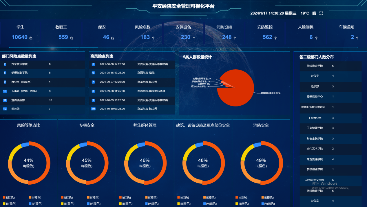 坚持隐患矛盾闭环数据化管理。以数据模型为支撑,深入分析研判场所设备风险、人员动态风险和管理引导风险等三大类风险,涵盖23个方面,识别出332个风险点,1563个危险源。为了更好地管理全校的安全风险隐患,将学校安全风险隐患实行清单管理,并按照风险级别从高到低分别用红、橙、黄、蓝四种颜色标识,实行各部门风险隐患差异化管控,保证校园安全风险管控更精准、更有效。