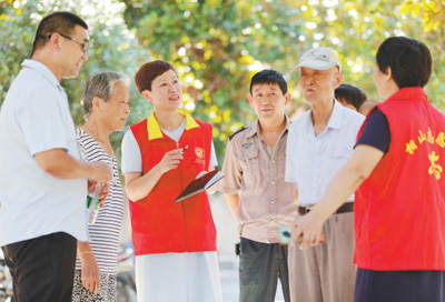 安徽淮北市相山区东山街道建国社区通过“村务会商”“邻里说事拉理”等方式,实现矛盾纠纷和群众诉求“一站式”解决。图为社区志愿者与群众交流。   冯树风摄