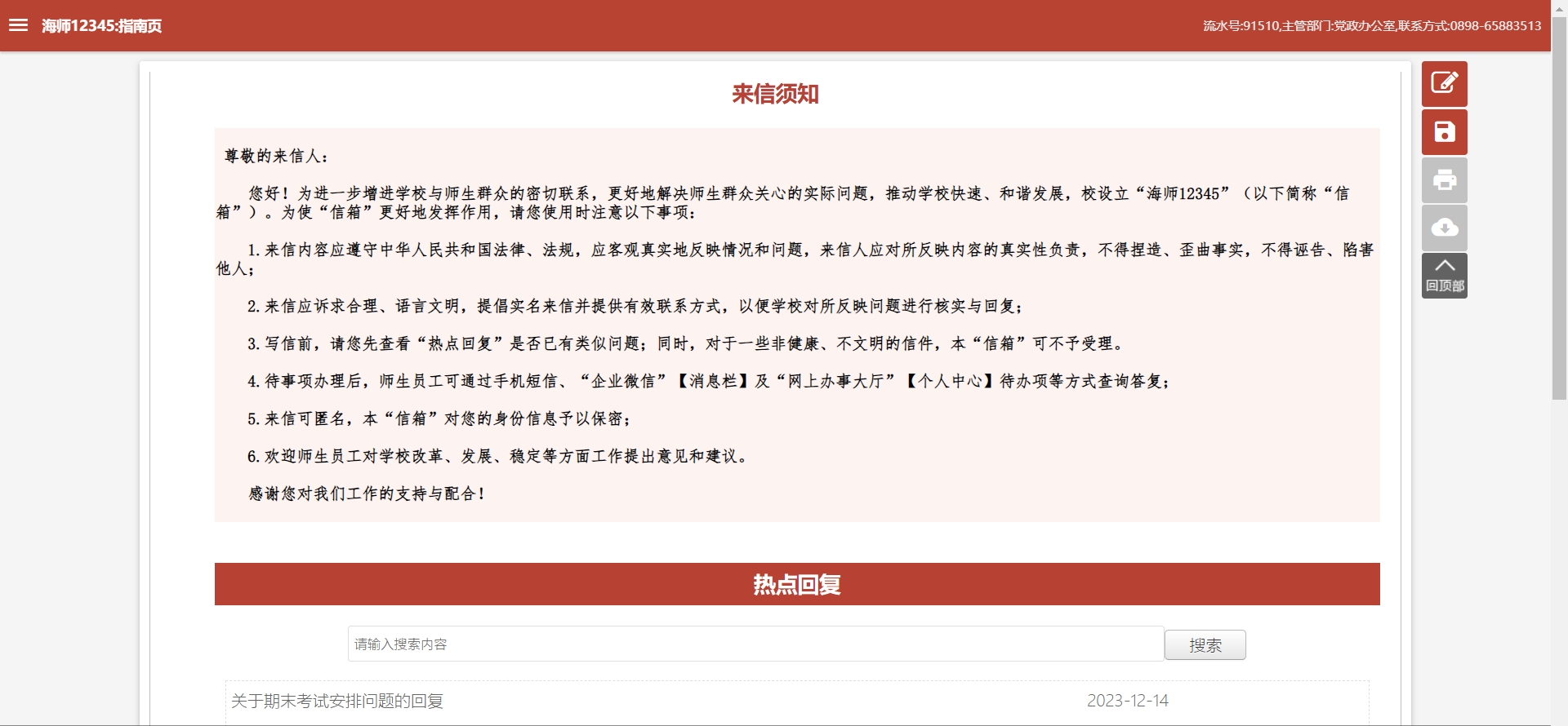 学校坚持把师生放在心中最高位置,依靠师生、服务师生,多措并举提升师生幸福感、安全感。积极构建以数据为基础的校园治理体系,应时所需,打造了凝结各方智慧、汇聚各方力量、回应各方需求的“海师12345”接诉即办平台。自平台上线9个月以来,已接收办理师生各类建议、诉求1200余件,建议诉求回应答复率100%,事项办结率100%,部门参与率100%。