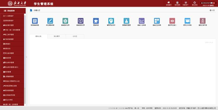 智“惠”平台,赋能服务提质增效。新疆大学充分整合多方资源,加快智慧社区建设。一是以“学生”为本,立足学生需求,不断完善学工系统。通过学工系统可以及时准确收集、分析、管理学生信息,掌握了解学生需求,提升服务学生效率,为学校相关部门科学化决策提供数据支撑。目前学工系统已整合奖助评选、心理健康测评、医保管理、信息维护等23个模块,意见反馈、舆情收集、防疫信息维护、班级管理等62项服务功能,业务涵盖学生在校期间各项学习生活需求,实现一站通办,方便快捷,形成学生从进校到离校的全过程信息化服务链。二是以“数据”为基,着眼管理需求,打造智慧便捷公寓系统。目前公寓系统已实现线上办理入住、调宿、退宿以及报修等服务功能全覆盖,将学生宿舍服务从传统的线下人工服务模式转变为线上服务操作,实现让数据多跑腿、让学生少跑路,有效解决学生“办业务来回跑,服务响应慢”的难题,大幅提升服务效率,为学生提供了更优质的服务。