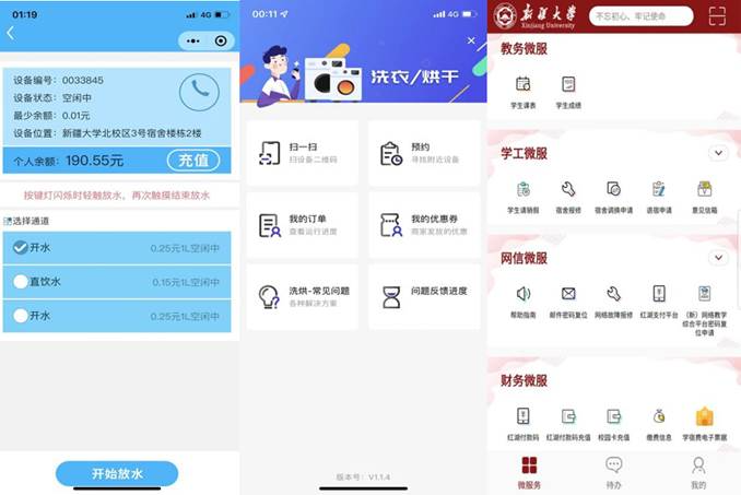 智“绘”生活,助力生活便捷高效。升级学生社区全域生活服务项目,持续打造优质学生社区生活园区,实现学生多元化需求一站式满足。用电系统使用集智能化控制、管理、反馈等功能于一体的智能控电管理平台,实现对学生宿舍用电实时管理,大功率智能断电检测,购电线上办理。洗衣设备全部实现学生足不出户在线下单、在线支付,定时提醒洗衣进程、搜索空闲洗衣机等服务。饮水设备目前已与校园卡数据联网,实现一卡通刷。每栋宿舍楼还设置自助服务区,提供自动售货机、微波炉、针线盒、电饭煲等日常生活用品,方便学生生活。广大学生在享受服务的同时,也培养了动手能力与生活自理能力。