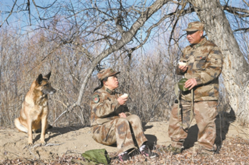 巡逻路上,随身携带的馒头冻得又冷又硬,马军武和张正美就着白开水往下咽。解放军报特约记者 王宁摄