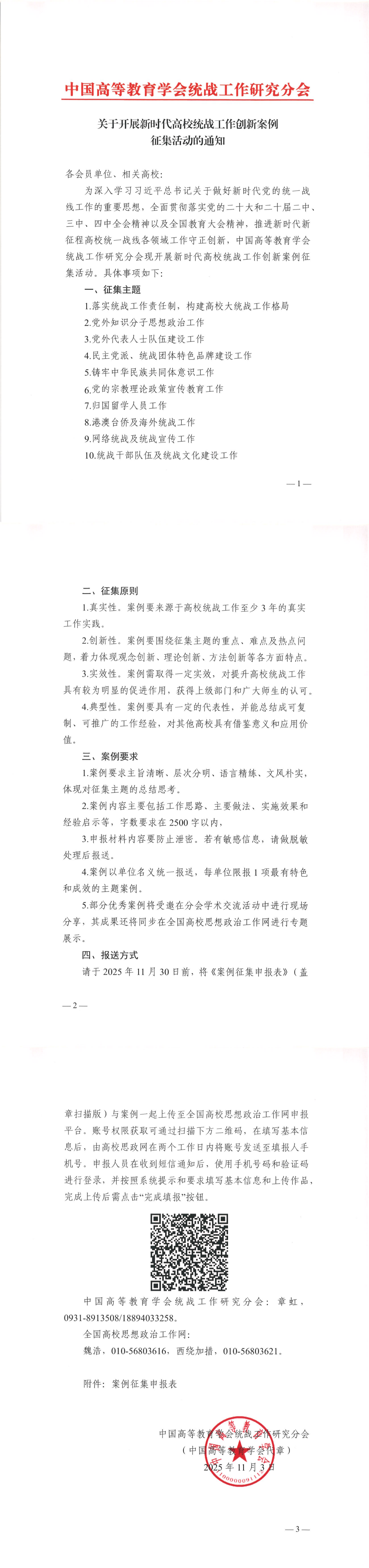 为深入学习习近平总书记关于做好新时代党的统一战线工作的重要思想,全面贯彻落实党的二十大和二十届二中、三中、四中全会精神以及全国教育大会精神,推进新时代新征程高校统一战线各领域工作守正创新,中国高等教育学会统战工作研究分会现开展新时代高校统战工作创新案例征集活动。具体事项如下: