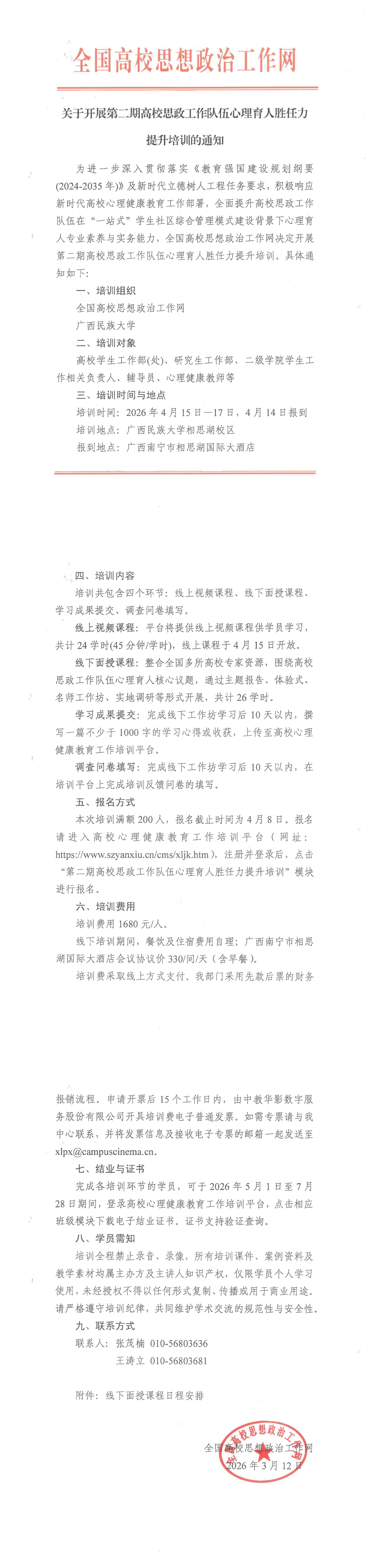 为进一步深入贯彻落实《教育强国建设规划纲要(2024—2035年)》及新时代立德树人工程任务要求,积极响应新时代高校心理健康教育工作部署,全面提升高校思政工作队伍在“一站式”学生社区综合管理模式建设背景下心理育人专业素养与实务能力,全国高校思想政治工作网决定开展第二期高校思政工作队伍心理育人胜任力提升培训。具体通知如下: