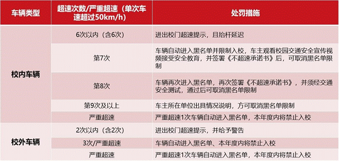 上海交通大学闵行校区校园内限制机动车行驶速度不得高于30km/h,车速超过50km/h视为严重超速,对于监测到的超速行为主要有三种处理措施,一是在校内各处道路LED牌上进行车牌号以及超速信息的全校范围内的公示,二是在有超速记录的车辆进出校时将超速信息显示在校门口的LED面板上并延迟5秒抬竿,提示驾驶员去保卫处进行违章信息的处理。三是拉入车辆管理系统黑名单,进入黑名单的车辆均为违章情节严重的车辆,此类车辆将直接被限制本年度入校。根据车辆违章程度以及次数的不同,相应处罚措施会有相应的变化,具体处罚措施如下表所示。