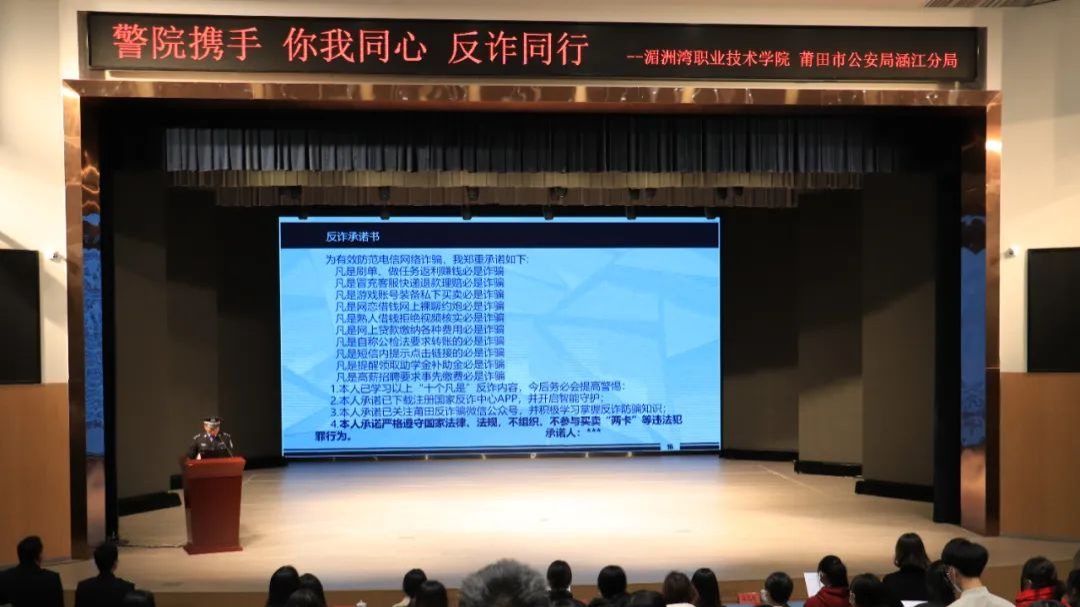 此次活动以“警院携手 你我同心 反诈同行”为主题。学院各院系同时开设分会场,以现场直播形式参与,共1.8万余人次观看。活动期间,莆田市公安局梧塘派出所警务队副队长俞益强为学院师生开展反诈骗安全教育讲座,介绍在校生学习生活中常见骗局,并结合当前最新的诈骗手法和最近发生的真实案例,向师生通报近阶段电信诈骗案件的发案情况,及紧急应对措施,以真实案例警醒师生。现场学生还跟随工作人员宣读反诈骗承诺书、观看反诈骗安全宣传展板,在反诈骗签名墙上签名,坚决支持公安部门深入开展反诈骗活动,守护好百姓钱袋子。