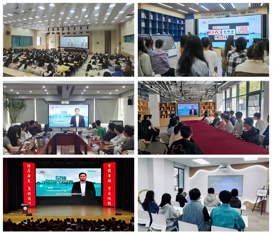 中南大学全民国家安全教育日活动暨第十六届大学生安全文化节活动于4月12日启动,启动仪式上湖南湘江新区为中南大学授牌“湖南湘江新区总体国家安全观教育基地”,为10名国家安全校园宣讲员颁发了聘书。北京联合大学深入开展全民国家安全教育日系列活动,内容丰富、形式多样,包括总体国家安全观主题展、专题讲座、创意作品展示、师生原创微情景剧、安全技能培训等,彰显学校在总体国家安全观提出十周年来的实践成果。西南政法大学与重庆广播电视集团(总台)联合策划,针对小学生、中学生、大学生三个年龄段群体,精准打造共24堂思政“金”课,通过“室内授课+室外实景实践”的方式,充分发挥广电媒体的视音频制作优势,促使教学过程完整化生动化,进一步增强思政课的感染力号召力。塔里木大学联合第一师阿拉尔市党委人民防线办举办2024年全民国家安全教育日“总体国家安全观·创新引领10周年”主题游园会,通过现场签名、拍照打卡、扫码答题、现场答疑、兑换宣传品等形式,激励参与学生了解国家安全相关法律法规及知识,增强全民共同维护国家安全的责任感和使命感。