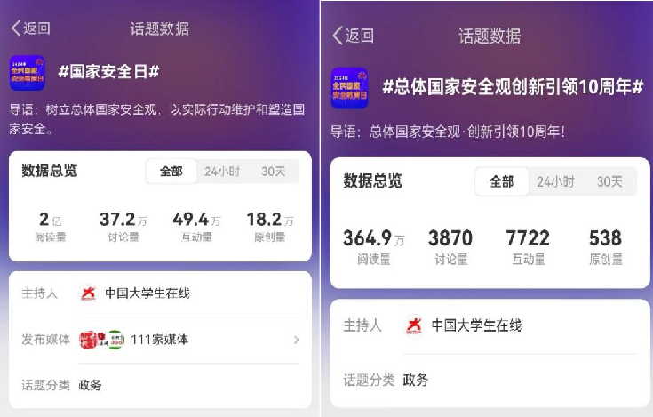 同时,中国大学生在线充分发挥活动引领作用和融媒体传播优势,策划发起全民国家安全教育日主题短视频创作活动,并提供视频模板和贴纸,联动全国高校官方全媒体平台带#国家安全日#话题标签创作优秀作品,引导青年学生携手共筑维护国家安全、社会稳定的安全长城。由中国大学生在线主持的全民国家安全教育日主微博话题#国家安全日#累计阅读量达到2亿,#总体国家安全观创新引领10周年#话题阅读量为597.3万。