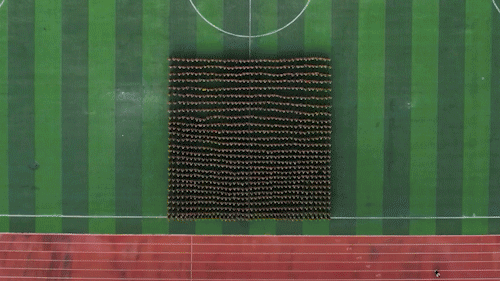 厦门大学军训结业典礼上,千名学子用整齐划一的动作拼接出强国有我、报效国家、喜迎二十大等图案。