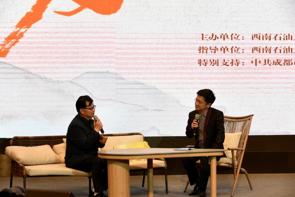 天府家风馆讲解员、西南石油大学艺术学院2019级校友周瑞讲述了何秉彝、卢德铭等爱国仁人志士的家风故事,西南石油大学艺术学院播音专业教研室党支部书记王炜与AI生成的杨慎(升庵)先生“超时空”对话,杨慎(升庵)第14代传人杨德力现场讲述杨氏家风家训,西南石油大学艺术学院播音专业教师关航通过脱口秀的方式分享自己的小家,西南石油大学艺术学院编导表演专业教师汤润达携女儿汤芷晴同台献舞《守护》反映石油工人的家庭故事,西南石油大学艺术学院编导表演专业王璇现场作画《莲》向学校献礼,杨阎芸辉通过琵琶和阮两款传统乐器弹奏《唱支山歌给党听》《如愿》。说、唱、弹、跳、画,一个个精彩的视听节目令现场师生沉浸其中,“家国天下”的课程主题不经意间深入人心。
