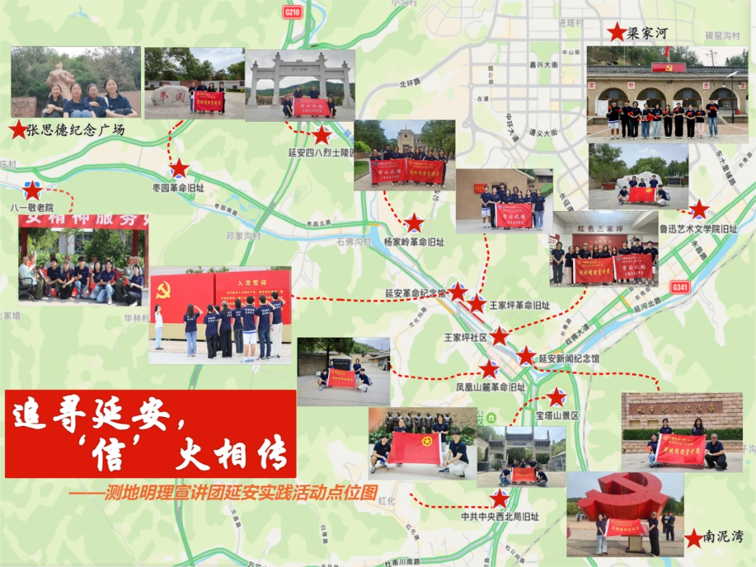 追寻延安,“信”火相传。测地明理宣讲团“学习之路”实践活动历时8天,共录制红色主题宣讲视频12个,宣讲团成员走过1个社区,1个敬老院,2座纪念馆,11处红色旧址,在山间河畔发掘红色故事,将红色资源转化为教材,将革命遗址变为思政课堂,用实践脚步丈量延安红色之路,用专业所长与青年视角记录延安新风。