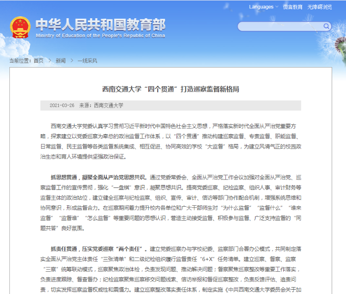 3月26日,教育部战线联播部属高校工作动态以“西南交通大学“四个贯通”打造巡察监督新格局”为题,专题报道了学校党委巡察工作。全文如下: