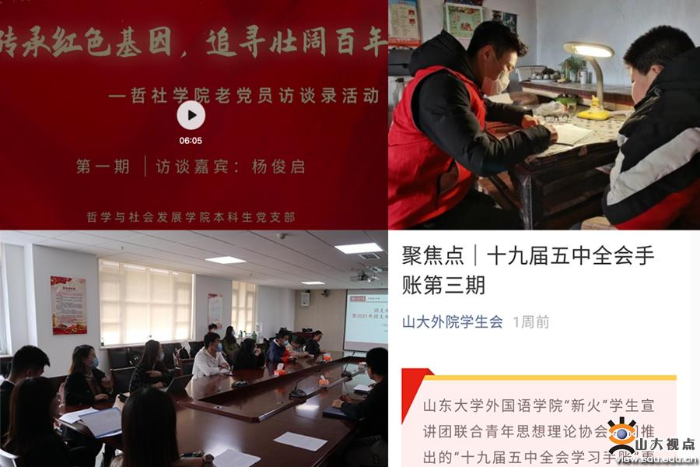 近日,为深入学习贯彻习近平新时代中国特色社会主义思想和党的十九大精神,以实际行动迎接建党100周年、建校120周年,山东大学开展以“五个一”为主要内容的本科生党员主题教育活动,即开展一次主题党日活动、参加一次组织生活会、阅读一本红色经典、举办一场成长交流会、组织一次社会实践服务,将其作为开展党史学习教育的重要载体,打造党史学习特色品牌的重要措施。各本科生党支部积极响应,广泛动员,结合学院特色、支部情况,开展了一系列形式多样、内容丰富的学习教育活动,取得了良好效果。