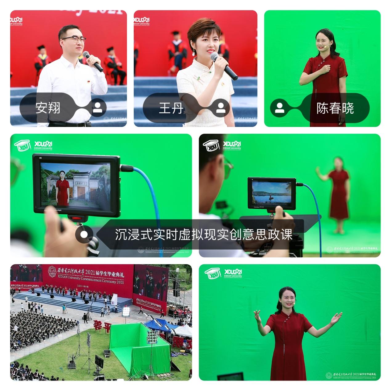 今天的礼仪广场东侧,绿幕演播室显得格外醒目。在思政课讲演达到高潮之时,毕业年级辅导员陈春晓走进绿幕演播室,借助“4K+5G”虚拟演播技术,再现学校不同历史时期的不同场景,展示了西电迁校史,传达了西电先辈“求真务实、爱国为民”的精神气概,给全体毕业生们带来了一场充满科技感的“鼓与呼”。