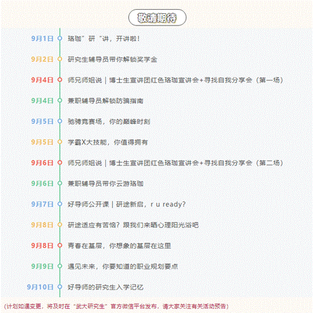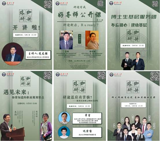 “我心目中的好导师”、陪伴同学们成长的辅导员、优秀的研究生朋辈等等各方珞珈研途力量倾情加盟,合力为新生打造10余项“服务菜单”,内容涵盖学术科研、职业规划、心理健康、校园生活等各个方面,大家或做客直播间担当主播,或在云端担当导游,或在推文中分享成长经历,各显神通,倾囊相授。直播、公开课、云游、推送等多元化的形式让研究生新生目不暇接,同学们关注的热情也持续高涨,每天直播还未开始,同学们就守候在直播室,在留言区催更,截至911日研究生新生报到前,前置启动的新生入学教育活动共计获得了30000余人次的关注。