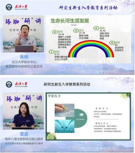 聚焦新生需求,科学设计珞珈“研”讲教育内容8月伊始,党委研究生工作部即通过研究生兼职辅导员摸底研究生新生诉求,以便精准供给服务。“好导师公开课”中,来自外国语言文学学院的马潇教授和电气与自动化学院的郭宇铮教授一文一理两位好导师为同学们深刻解读本研阶段的学习差异、如何做好科研规划、如何撰写学术论文等问题。中科院院士夏军等10位好导师用文字分享曾经的入学记忆和研途感悟,用自身经历为研究生新生传道解惑。研究生专兼职辅导员云端守候,为研究生新生解锁奖学金、防骗指南“全貌”,带领研究生云游珞珈,携手专业老师守候直播室,为同学们解除研途适应苦恼,帮助同学们明晰未来职业规划要点。“师兄师姐说”中,有优秀的“学术之星”为大家分享“学霸X大技能”,还有博士生宣讲团、博士生基层服务团的优秀学长依次上场,他们为研究生新生讲述红色珞珈故事,让同学们在徜徉校史的过程中感悟珞珈精神;他们解答研究生新生关于学术科研、社团生活、基层锻炼等困惑,帮助新生寻找真正的自我。