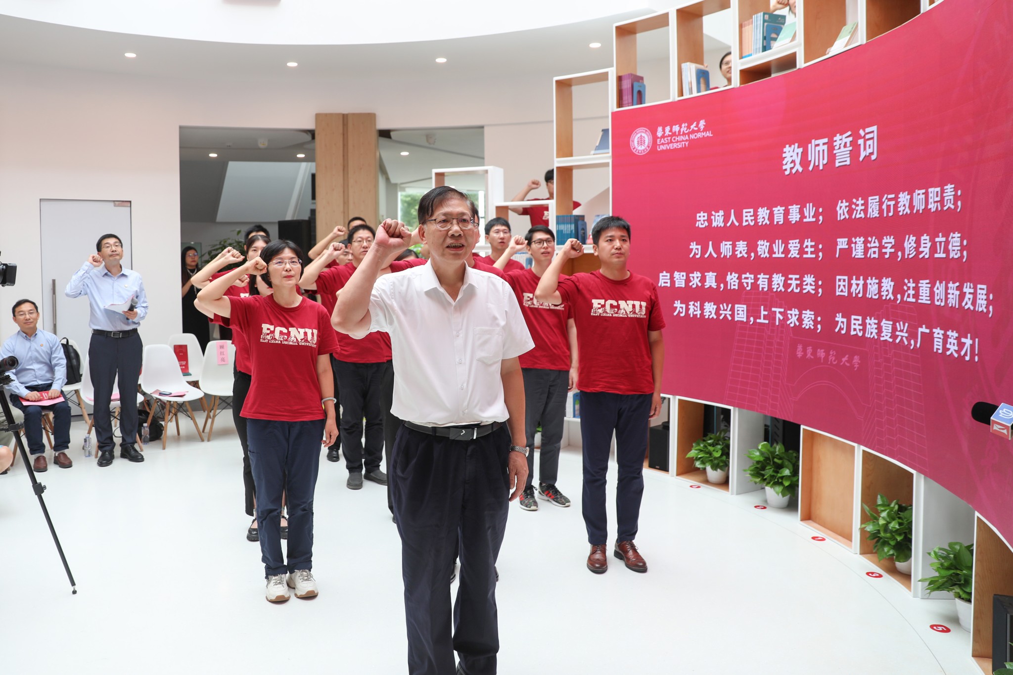 国家教学名师、华东师大地理科学学院郑祥民教授的带领新入职教师代表面向国旗庄严宣誓