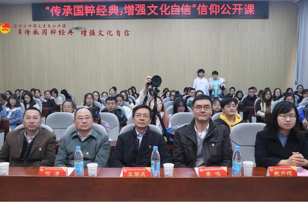 11月24日,由苏科大校团委主办、文学院团委承办的《传承国粹经典,增强文化自信》信仰公开课示范课在文学院报告厅举行。校党委副书记王荣庆,校团委书记章鸣,文学院党委书记何清、党委副书记兼副院长瞿晓庆、相关老师及110余名大学生聆听了公开课。
