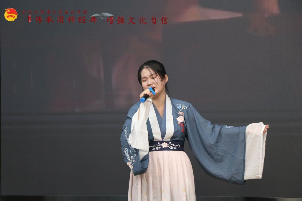公开课在汉服社的“汉仪礼呈”展演中拉开帷幕。社长罗佩旋围绕唐宋明三代汉服的历史渊源、形制特点与工艺美学展开讲解。中文系副教授鲍开恺老师从角色、典故、曲谱等方面讲解了著名昆曲篇目《牡丹亭》,并与张辰圆同学共同演绎经典唱段《寻梦·懒画眉》,生动细致的表演展现了戏曲的隽永之美。