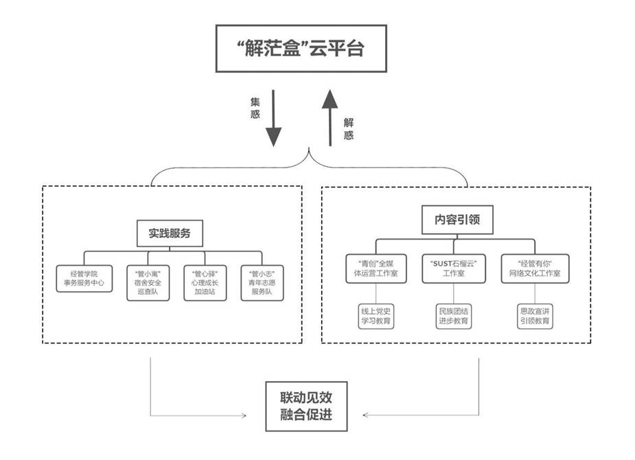 以学生需求为导向,增加“解茫盒”云平台功能,优化平台建设,增强平台服务力,在此基础上,强化学生队伍培养,加强品牌化实践队伍和网络文化工作室建设,持续扩大“解茫盒-我为学生办事”品牌的亲和力、影响力,多措并举,将线上线下育人工作深度融合,不断完善服务功能,探索工作长效保障机制,不断提高立德树人的育人成效。