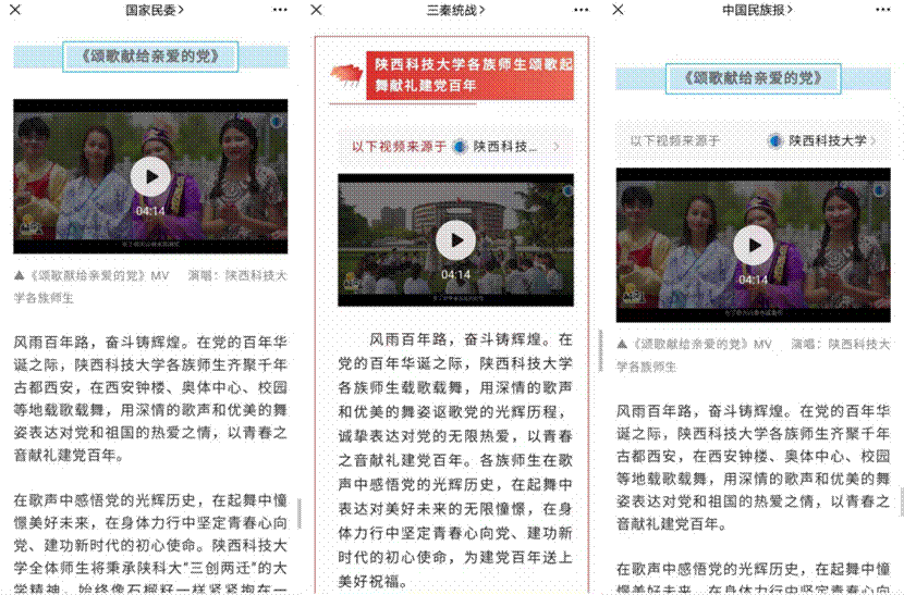 “SUST石榴云”工作室通过各类线下活动与线上宣传进行民族团结进步教育。2021年恰逢建党百年,工作室将“建党百年”与“民族团结进步教育”有机结合,创作视频作品《颂歌献给亲爱的党》庆祝建党百年,祝伟大的祖国生日快乐。视频一经发布在网上广泛传播,并受到国家民委、三秦统战、中国民族报等多家官方媒体的转载报道。