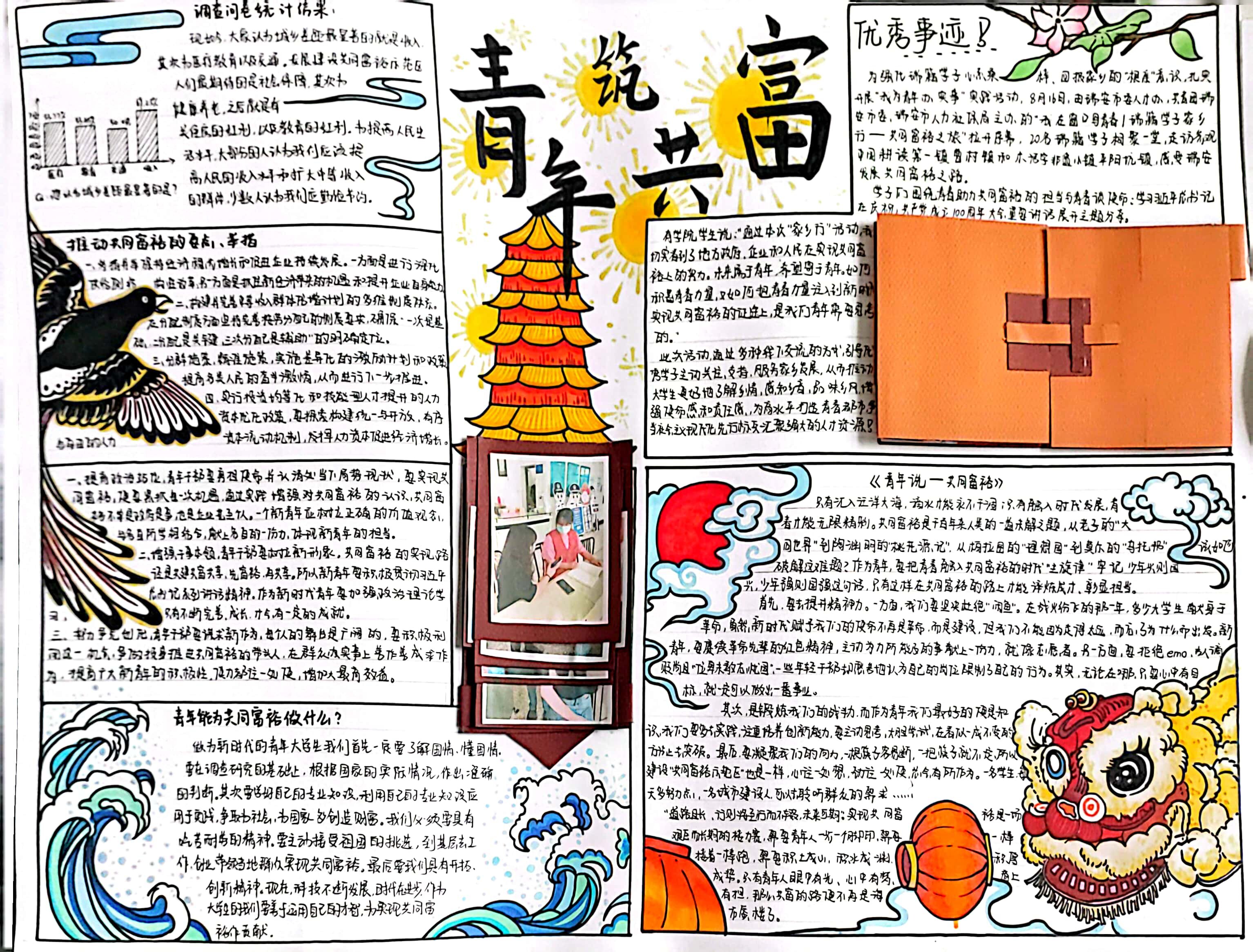 为庆祝党的二十大的胜利召开,实现第二个百年奋斗目标,实现中华民族伟大复兴的中国梦,牢记习近平总书记对浙江的殷殷嘱托,勇担历史使命、勇当探路先锋,与时俱进书写忠实践行“八八战略”新篇章,推动在高质量发展中实现浙江省“两个先行”,浙江经济职业技术学院马克思主义学院利用思想政治理论课实践教学组织2021级3000多名学生开展了一年一度的“三千学子同绘一幅画”思政课综合实践活动,同学们深入基层调研、交流访谈、通力合作,提交了一幅幅内涵丰富、创意十足、精心打磨的作品。为展示学校思想政治理论课实践教学成果,10月11日起,由马克思主义学院主办的“同盼亚运喜迎二十大,三千学子齐绘‘共富’画”思政课实践教学成果展在崇文行政楼一楼大厅举行。
