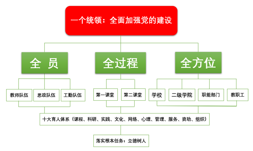 学院实施“课程、科研、实践、文化、网络、心理、管理、服务、资助、组织”十大育人工程,做到了课程育人有成效、科研育人谱新篇、实践育人强技能、文化育人举旗帜、网络育人守阵地、心理育人润心灵、管理育人促改革、服务育人惠民生、资助育人暖人心,组织育人显活力,实现了“筑魂、筑才、筑梦”育人目标,2021年学院获批为四川省第二批“三全育人”综合改革试点高校,2022年学院被评选为四川省职业院校“三全育人”典型学校。
