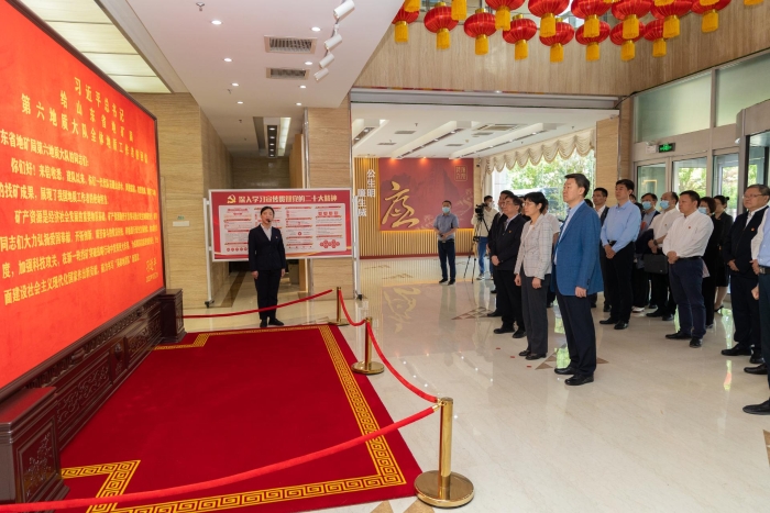 在第六地质大队办公楼习近平总书记回信屏风前,参加活动人员重温了习近平总书记重要回信精神,进一步感悟重要回信重大意义和深刻内涵,切身体会习近平总书记对做好矿产勘查工作的殷切期望和对全体地质工作者的深情厚爱。在六队队史陈列馆,大家在讲解员的解说下,通过文字、实物、图片、多媒体、VR体验等方式,全方位系统回顾“英雄地质队”发展历程,了解一代代地质工作者坚定不移听党话、跟党走,大力弘扬爱国奉献、开拓创新、艰苦奋斗优良传统,取得丰硕找矿成果的生动故事,进一步激发了爱党爱国热情,增强了地质报国的使命意识和责任担当。