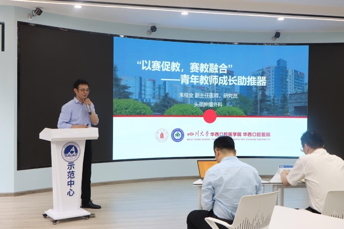 全国高校青年教师教学竞赛医科组一等奖获得者、四川大学华西口腔医院朱桂全研究员带来了题为“以赛促教赛教融合——青年教师成长助推器”的第一场报告。他分享了自己从“教无定法”“教需有物”“教有思想”到“教有理论”的逐步提升过程:2020年刚开始接触教学时,自己关注的是互动、气氛、教具模型;2022年参加校赛、省赛时,关注重点转向教学内容的“两性一度”;2023年进入国赛后,关注点开始聚焦于教学核心价值是什么,并运用多种教学方法把核心思想融入内容。他鼓励青年老师们积极参与教学类比赛,从而能够快速提升自己的教学能力。