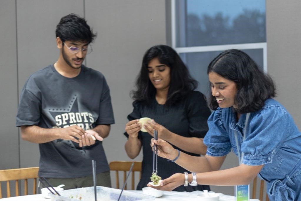在“舌尖上的乡村”活动中,师生们一起体验“包饺子”,共赏中国传统美食。马来西亚的郑宇珍同学表示:“我很喜欢中国的美食,中国的美食品种很多,特别是淮安,有龙虾、茶馓、蒲菜等。”