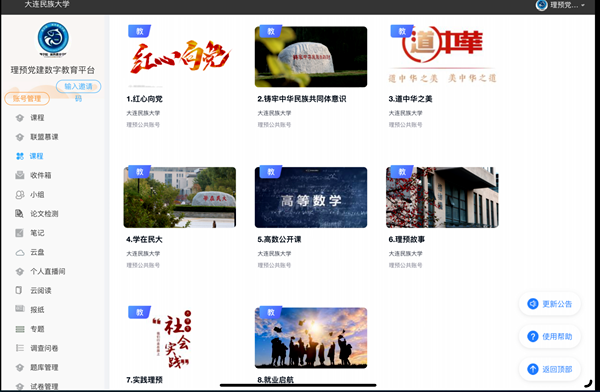 “红心向党”“铸牢中华民族共同体意识”“道中华之美”……打开理学院、预科教育学院的学习通“党建数字化教育教学平台”,这些栏目映入眼帘。党建数字化教育教学平台是学院开拓“互联网+教育”建设的新模式、新阵地,不仅设置了学院的特色栏目“高数公开课”“理预故事”,还有很多关于党建、中华优秀传统文化的栏目。