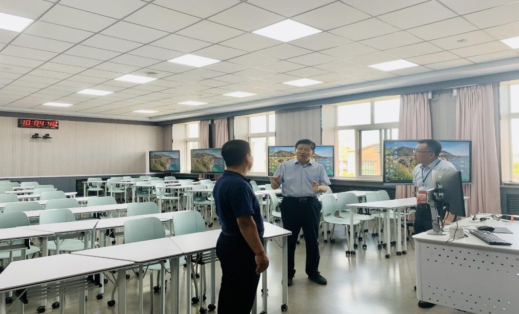 在第四教学楼,钱建华听取教务处处长李会鹏关于暑期中第三批智慧教室升级改造工程和全新的教学环境打造的工作汇报,并视察了五楼智慧教室布局使用情况。他强调,教务处持续做好新学期课堂教学、教学设施运行、教学条件保障、教学秩序维护和教学质量监控工作,督促教师积极进行教学改革,充分利用信息技术手段,创新教学方式,提高教学效率与质量,确保优良的教风、学风、校风再上新台阶。
