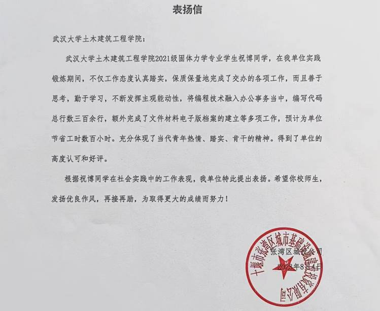 在十堰市张湾区实践锻炼期间,土木建筑工程学院2021级硕士研究生祝博创造性地将编程技术融入日常办公中,编写了三百余行代码,独立完成了文件材料电子版档案的建立等多项工作,自身能力在实践中得到了充分锻炼。他表示,本次暑期实践给他提供了一个施展才干的舞台,让他深刻意识到,做任何工作都应该充分发挥自身主观能动性,多了解、多学习、多思考、多总结,主动去做一些“分外之事”,并做实做好。