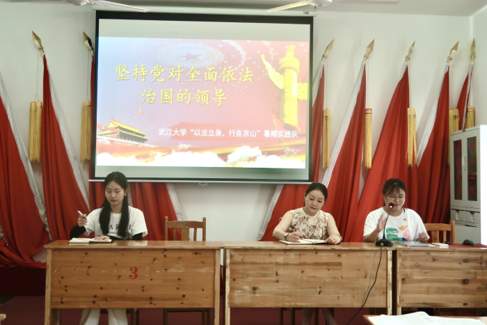 为助力乡村法治建设,强化村民法治意识,武汉大学“以法立身,行在京山”研究生法治先锋实践队赴京山市四岭村开展“送法下乡”理论宣讲活动。中国边界与海洋研究院2022级硕士生刘腾飞围绕坚持党对全面依法治国的领导的意义、内容和实践要求,就新时代法治建设相关内容进行了宣讲,她号召全体村民要始终坚持“两个确立”,做到“两个维护”,矢志不渝做习近平法治思想的坚定信仰者和忠实实践者。实践队员走村入户,分发普法宣册,通过现场答疑、以案释法的方式向村民宣传《宪法》《民法典》《法律援助条例》等相关政策法规,受到村民群众的一致好评。
