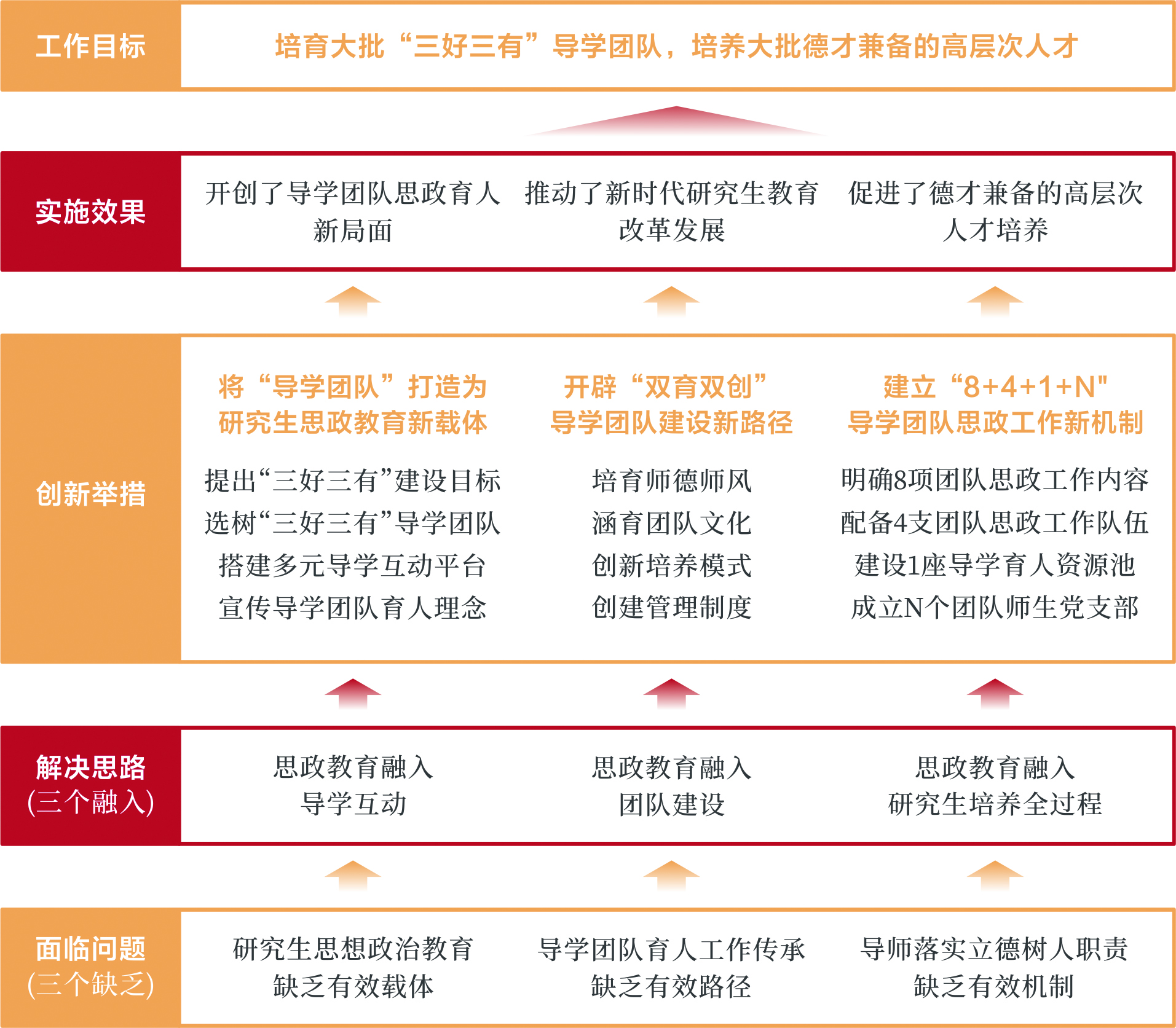 学生在哪里,思想政治工作就要做在哪里。针对当前研究生教育存在的“三个缺乏”问题,西安电子科技大学提出了研究生思政教育“三融入”理念,即思政教育融入导学互动、融入团队建设、融入研究生培养全过程,把思政教育载体由学生班级拓展到导学团队,构建了特色鲜明的“三好三有”导学思政育人体系,建立起“8+4+1+N”导学团队思政工作新机制,形成了新时代导学团队传承发展的新范式。