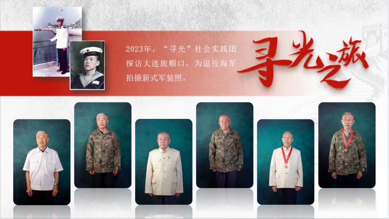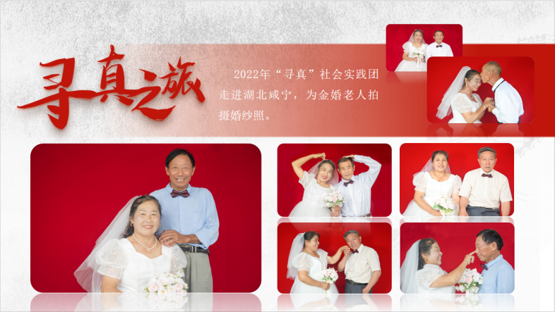 习近平总书记提到:“大道至简,实干为要。新征程是充满光荣和梦想的远征,没有捷径,唯有实干。”学院鼓励学生用脚步丈量祖国大地,用内心感应时代脉搏。将体美育人与志愿服务、社会实践相结合,开展“追寻”系列社会实践活动,实践团队由数字媒体专业学生组成,连续两年用镜头探访中国变化,用图片感受祖国大地,用专业赋能实践研究,以感知体验为根本,不断激发学生积极情感,培养积极人格,提升精神境界,彰显“信仰之美、崇高之美”。2022年,“寻真”社会实践团走进湖北咸宁,为金婚老人拍摄婚纱照;2023年,“寻光”社会实践团探访大连旅顺口,为退役海军拍摄新式军装照。“寻真”实践团在2022年团中央“镜头中的三下乡”活动中被评为优秀视频团队,社会实践成果被收录于全国高校数字艺术设计大赛设计赋能乡村振兴教学案例,“寻光”实践团今年已入围“镜头中的三下乡”优秀视频团队和中国青年报“千校千项”评选,同时作为校级一等奖的获奖团队被推报至湖北省参评省级优秀团队。