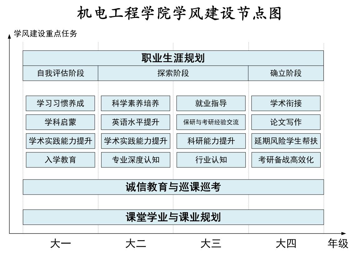 党委统筹科学化,提升教学质量。学院始终把学风建设作为育人工作的重要环节,注重强化学风建设顶层设计。学院党委对本科生学风建设进行专项调研,充分了解不同年级学生学情特点,科学分析不同阶段的学风建设重点任务及易挂科课程,绘制“学风建设节点图”和“课程学习预警节点图”,并细致部署全院学风创优建设工作。学院各部门以此为指导将学风建设工作“做在前面、做在平时”,强调学生学习全过程管理,最大程度培育优良学风。学院高度重视学生课堂质量,依据《武汉理工大学“党委抓课堂”工作实施方案》相关规定,完善落实《学校各级领导干部和教学管理人员听课制度》,形成检查教学情况和课堂纪律的常态化机制。由学院领导、系主任、系教学主任、教学办、学工办人员组成巡查小组,每周集中进行课堂听课和观摩,同时开展教风学风巡查,对课堂秩序、学生出勤、师生上课风貌等情况进行全面巡查。课后,辅导员根据巡查小组反馈的记录表对学生进行谈话,同时加强与任课教师的沟通和联系,及时掌握学生上课和作业完成情况。确保教师“教”与学生“学”良性互动,真正实现教学相长。