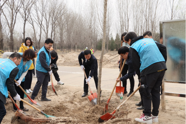 北臧村镇永定河绿色港湾林地,杨柳依依,春花争艳,松柏苍翠,呈现出一派春的气息。在林地间一处空地上,是一片热火朝天的劳动景象。在这里,中国传媒大学师生同北臧村镇干部职工一起,挥锹铲土,提桶浇水,种下一棵棵杜仲树。新种植的杜仲树虽然只有主干,但是它蕴藏着能量,孕育着希望,代表着成长。正如李众副书记所说:我们撒下的一锹锹土,种下的是树苗,也是生态文明的希望;泼下的一桶桶水,浇灌的是土壤,也是美丽中国的梦想。
