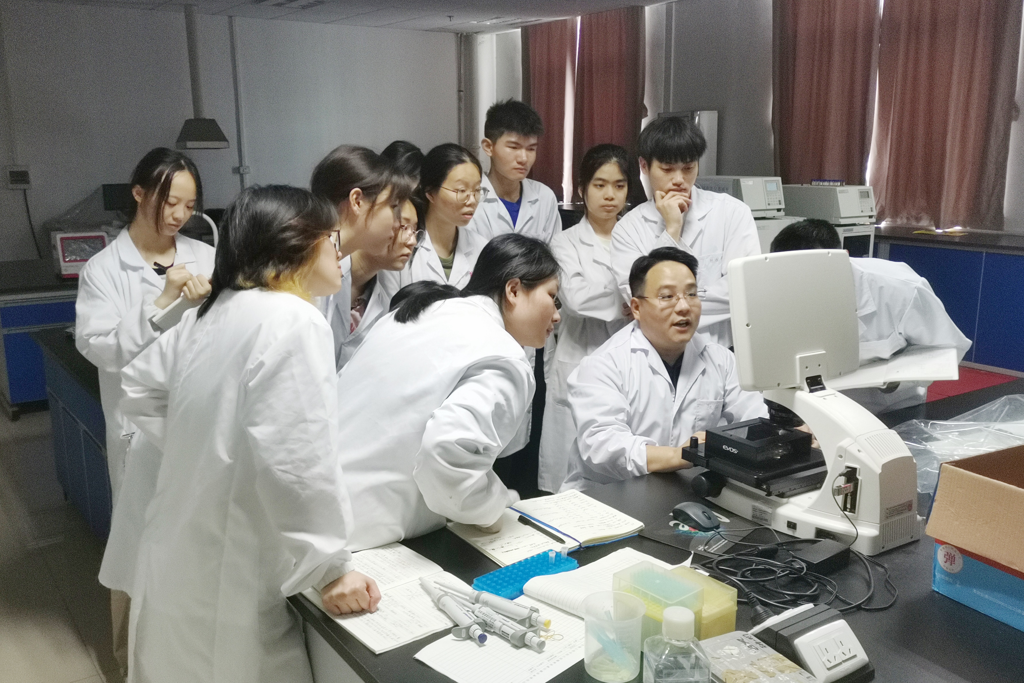 刘磊磊(前排右二)正在指导学生实验