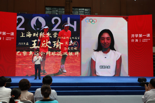 2019级上财校友、巴黎奥运会网球混双银牌得主王欣瑜讲到站在巴黎奥运会赛场上时,看到一面面为她加油的五星红旗,爱国情怀油然而生,在奥运赛场上为国征战、拼搏奋斗的经历还是让她收获颇丰、久久不能忘怀。