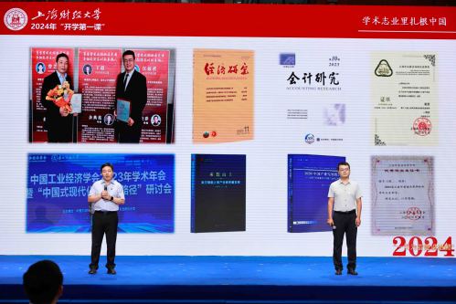 商学院余典范教授和王超校友讲述了上财师生聚焦新时代党和国家重大发展战略,立足财经专业优势,迎难而上、攻坚克难的科研故事,并勉励新同学们要勇于面对时代命题、锻造深学笃行本领、与上财大平台双向赋能,才能做出真学问、大学问,才能践行“厚德博学,经济匡时”的校训。