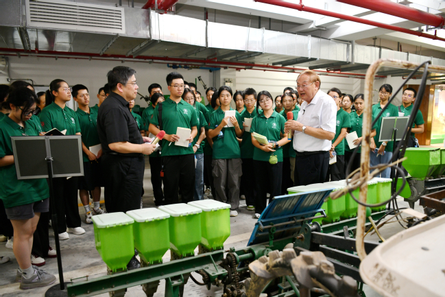 在水稻机械化博物馆,罗锡文院士结合自身50多年攻坚农业机械关键技术的工作经历和创建无人农场的生动实践,向同学们介绍了我国农业机械化的发展历程。薛红卫和同学们一同参观、边走边听,鼓励同学们学习罗锡文院士等华农科学家们的精神,既要脚踏实地开展研究、坚守为民情怀,也要敢于开拓创新、求精图变。