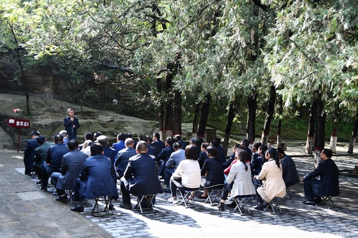 9月20日上午,延安大学党委理论学习中心组“不忘初心、牢记使命”主题教育学习现场教学会在杨家岭革命旧址—中央大礼堂前举行。延安大学党委书记薛义忠、党委副书记田伏虎、纪委书记苏醒仁、副校长王刚,全体校党委委员以及各院系党委书记、机关党委各支部书记参加现场教学会。会议由校党委委员、宣传部部长杜红荣主持。