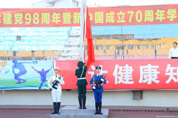 2019年7月1日清晨,学校在田径场举行“七·一”升国旗仪式和学生党员主题教育活动,隆重庆祝建党98周年暨新中国成立70周年华诞。校党委副书记田伏虎,党委组织部部长姚正宽、学工部部长高峰、团委书记李扬,化工学院党委书记舒永安、建工学院党总支书记陈兴军,全体学工干部以及全校3200余名学生党员和入党积极分子参加活动。活动由学工部副部长张翔主持。