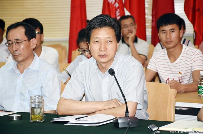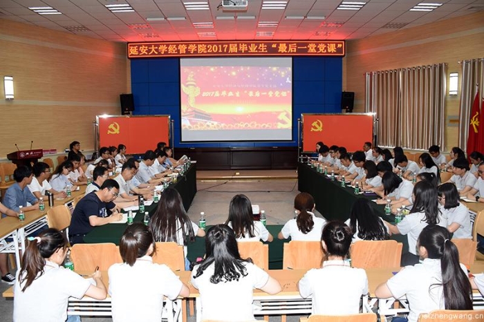 “即将启程去另一片天地,这一课是母校给予我们毕业生党员的珍贵礼物,在此聆听真情嘱托,谆谆教诲,完成一名党员又一次的蜕变。”毕业生党员马颂浩如是说。6月22日下午,经管学院2017“毕业生最后一堂党课”主题党日活动在路遥报告厅举行。延安大学党委书记薛义忠参加活动并为毕业生党员讲了党课。校党委副书记田伏虎,党委委员、组织部部长姚正宽,党委委员、宣传部部长杜红荣,党委委员、学工部部长高峰,团委书记李杨,党委办公室、校长办公室副主任兰鸿涛,经管学院院长姬雄华、党委书记姜庆,以及40名毕业生党员和10名学生党员代表等参加了党日活动。党日活动由经管学院学生第三党支部书记王欢主持。