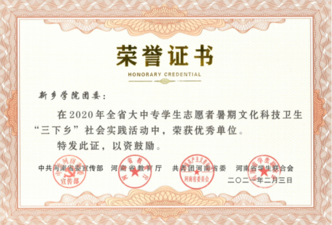 新乡学院团委荣获2020年河南省大中专学生志愿者暑期“三下乡”社会实践活动多项荣誉