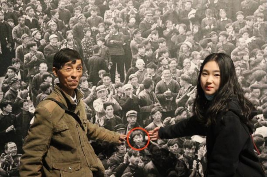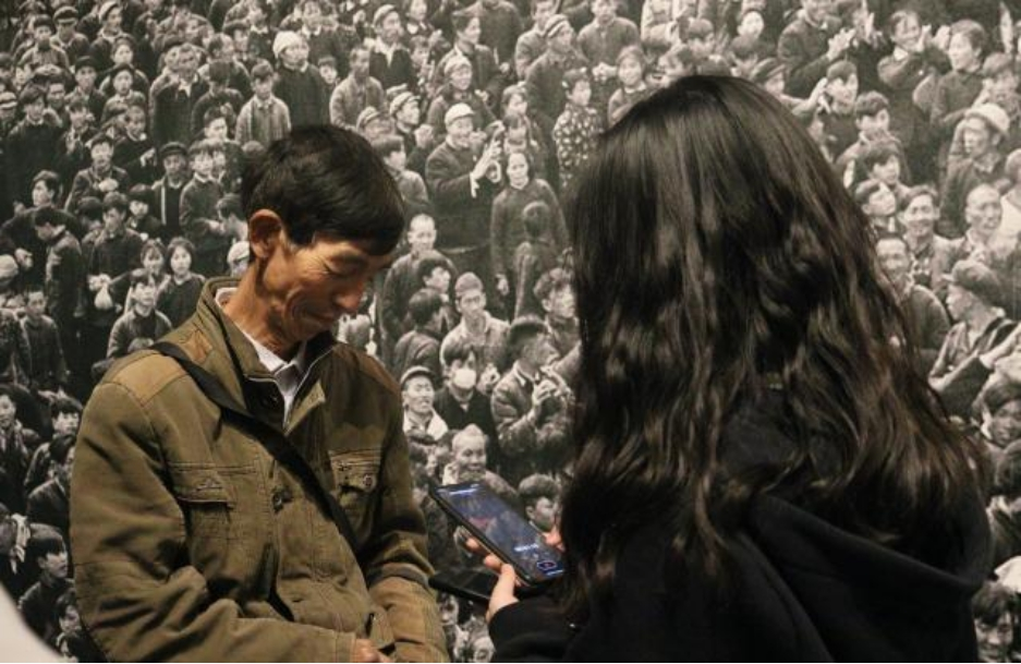 经采访,实践小组了解到原来老人就是当年红旗渠建设大军中的一员,桂计生。当年投身建设的他年仅14岁。岁月不居,已逾古稀的桂计生和曾经14岁的少年以一种特殊的方式“相见”。桂计生颤抖地指向一个戴帽子的少年,激动地开口:“我那年14岁,那天是红旗渠开渠典礼,当时我在人群里面,现在还有这个图像,我可以找到,是这一张。我那时候个子小看不见,一只手扶着旁边人的肩膀,努力踮着脚往对面看,挺隆重的当时。”画卷中可以看出,渠畔人潮拥挤、万分激昂,林县人民多年的夙愿在那一天终于实现了。