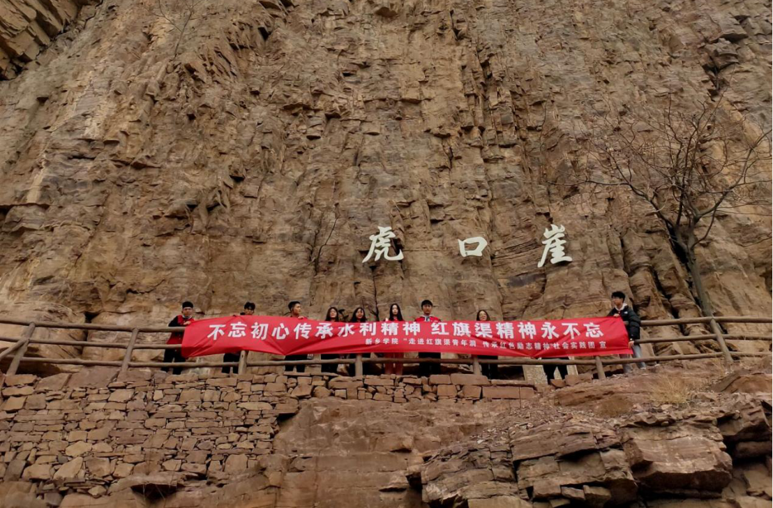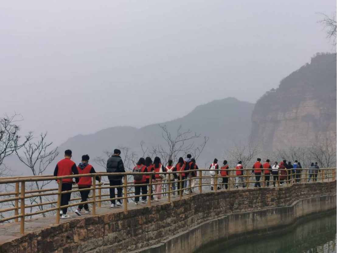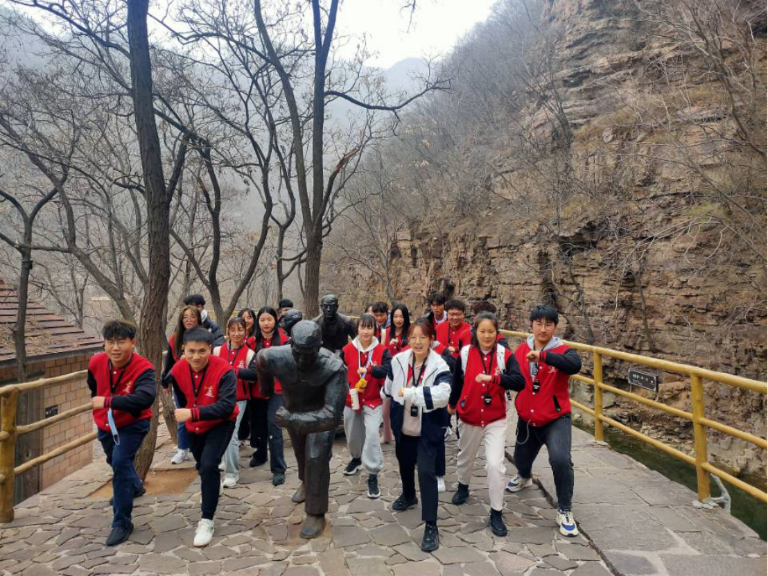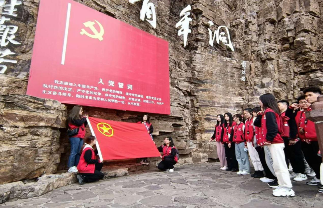 之后,团队代表成员在科学精准有效的防控措施保障下到达红旗渠进行实地考察。成员们对红旗渠有一定的了解,全体成员对红旗渠纪念馆进行参观记录,游览完纪念馆之后稍作休息,便出发前往红旗渠青年洞考察其实况,开始对红旗渠青年洞的全面了解,体会当时的青年艰辛地建设红旗渠的历程和重大意义。沿途而行中看到了红旗渠修建环境的恶劣,在悬崖峭壁上修建红旗渠,他们崖当房、石当床也毫无怨言,他们用着最简单的工具做着极不平凡的事。用“水鸭子”进行测量,用小推车运送一块一块的石头,妇女突击队辛苦地打钎等等很多场景让我们了解了修建红旗渠背后的不易。在青年洞看到人工天河在山崖的腰间蜿蜒流淌,感受红旗渠这一伟大工程的震撼,在青年洞中的霓虹灯掩饰不了修建的艰辛,每一寸的凿面都来自那一群辛苦劳作的年轻生命,劈山开河的老炮眼也是他们艰苦奋斗的象征……在这里的每时每刻无不使我们感动震撼,我们也怀着激动的心情在这里重温了入团宣誓以表达对英雄们的致敬以及让我们传承这份精神。