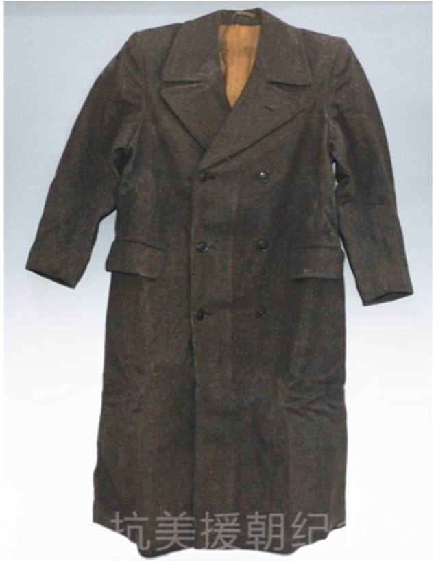 这件文物年代为1950年,质地为毛、棉麻纤维,衣长120 厘米、胸围110厘米,翻领,双排扣。这件呢大衣是金日成首相赠送给志愿军副司令员邓华的,是中朝友谊的历史见证。