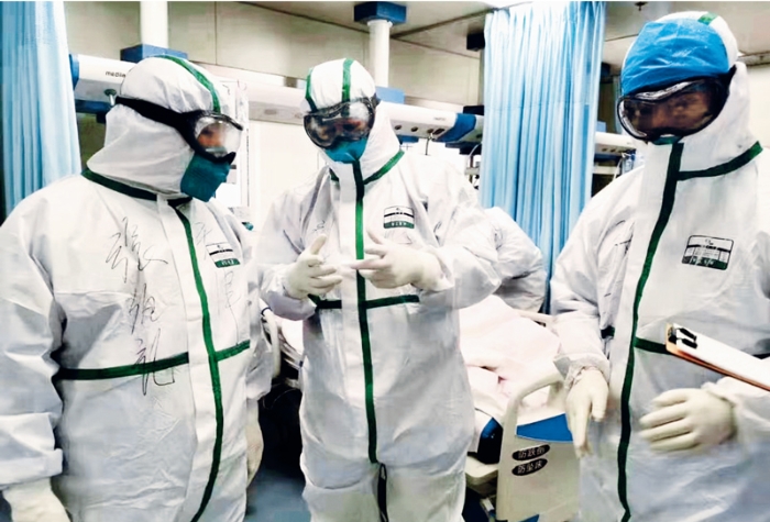 2020年2月10日,中央指导组专家张伯礼院士(左)在武汉市中医医院查看新冠肺炎重症患者,指导中医药救治。 天津中医药大学供图